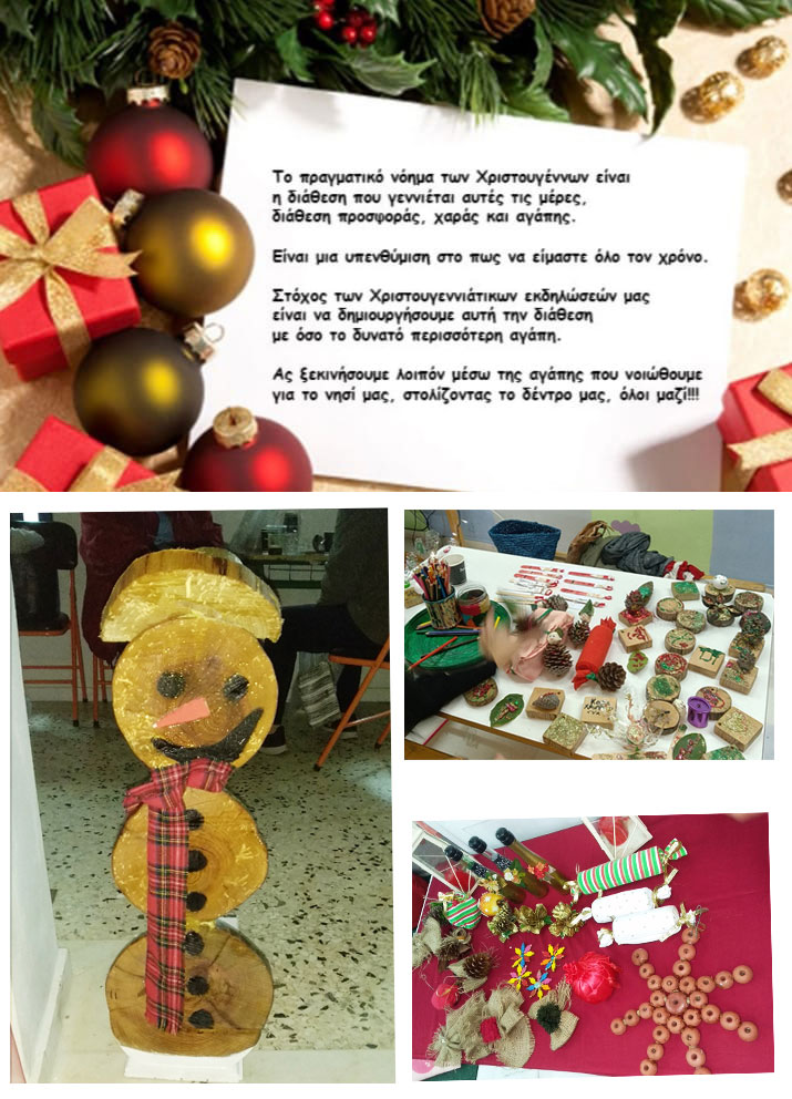 Στην τριήμερη εκδήλωση καλέσαμε τους γεροντότερους του νησιού για να μας πουν τι σήμαιναν γι’ αυτούς τότε τα Χριστούγεννα και πραγματοποιήθηκαν εργαστήρια για μικρούς και μεγάλους, όπου κατασκευάστηκαν τα χειροποίητα-ανακυκλώσιμα στολίδια του δέντρου με υλικά από τα σπίτια των κατοίκων, αξιοποιώντας το μότο των γεροντότερων: «Δεν πετούσαμε τίποτα». Προηγήθηκαν λαϊκές συναντήσεις προκειμένου να συλλέξουμε ιδέες και προτάσεις, με σκοπό να αναβιώσουν ξεχασμένα ήθη και έθιμα του νησιού, καλώντας γιαγιάδες και παππούδες. Παράλληλα έγιναν κάποιες συναντήσεις με σκοπό τη συνεργασία, την ανταλλαγή ιδεών και προτάσεων με τους κατοίκους του νησιού. Ακόμη παρουσιάστηκε θεατρικό από τους μαθητές του γυμνασίου με θέμα : «Το πραγματικό νόημα των Χριστουγέννων». “Αυτά τα Χριστούγεννα θα είναι διαφορετικά”, βροντοφώναξαν οι μαθητές και πέρασαν το μήνυμα ότι τα Χριστούγεννα έρχονται απλώς για να μας υπενθυμίσουν ότι πρέπει να διατηρούμε τη διάθεση χαράς, αγάπης και προσφοράς αυτών των ημερών όλο τον χρόνο και ακόμα ότι τα Χριστούγεννα έρχονται για να μας δείξουν πώς είναι να νιώθεις και πράττεις σαν να είναι η κάθε μας μέρα Χριστούγεννα