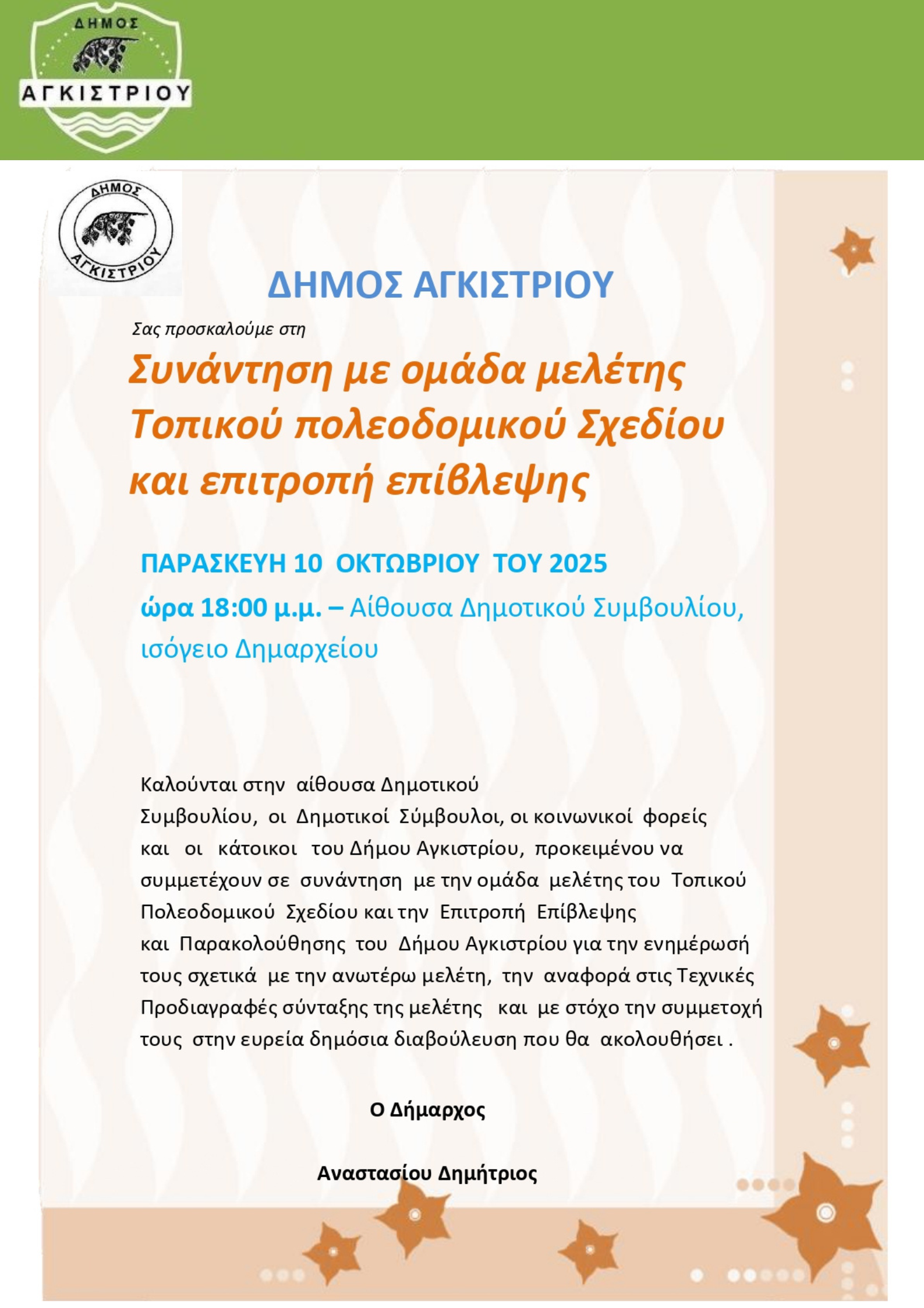 Πρόσκληση σε Συνάντηση με ομάδα μελέτης Τοπικού Πολεοδομικού Σχεδίου & επιτροπή επίβλεψης 2 Οκτωβρίου 2025 ΑΝΑΚΟΙΝΩΣΕΙΣ, ΔΕΛΤΙΑ ΤΥΠΟΥ