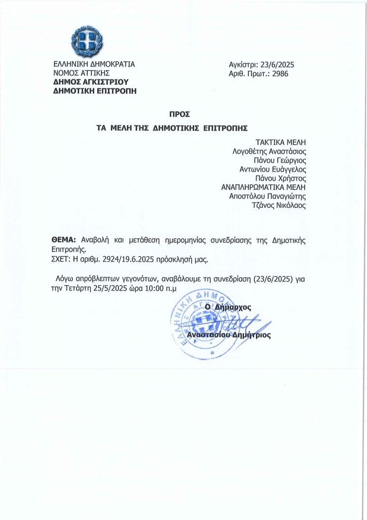Αναβολή 20ης Συνεδρίασης Δημοτικής Επιτροπής 25 Ιουνίου 2025 ΠΡΟΣΚΛΗΣΕΙΣ ΣΥΜΒΟΥΛΙΩΝ ΔΗΜΟΤΙΚΗΣ ΕΠΙΤΡΟΠΗΣ