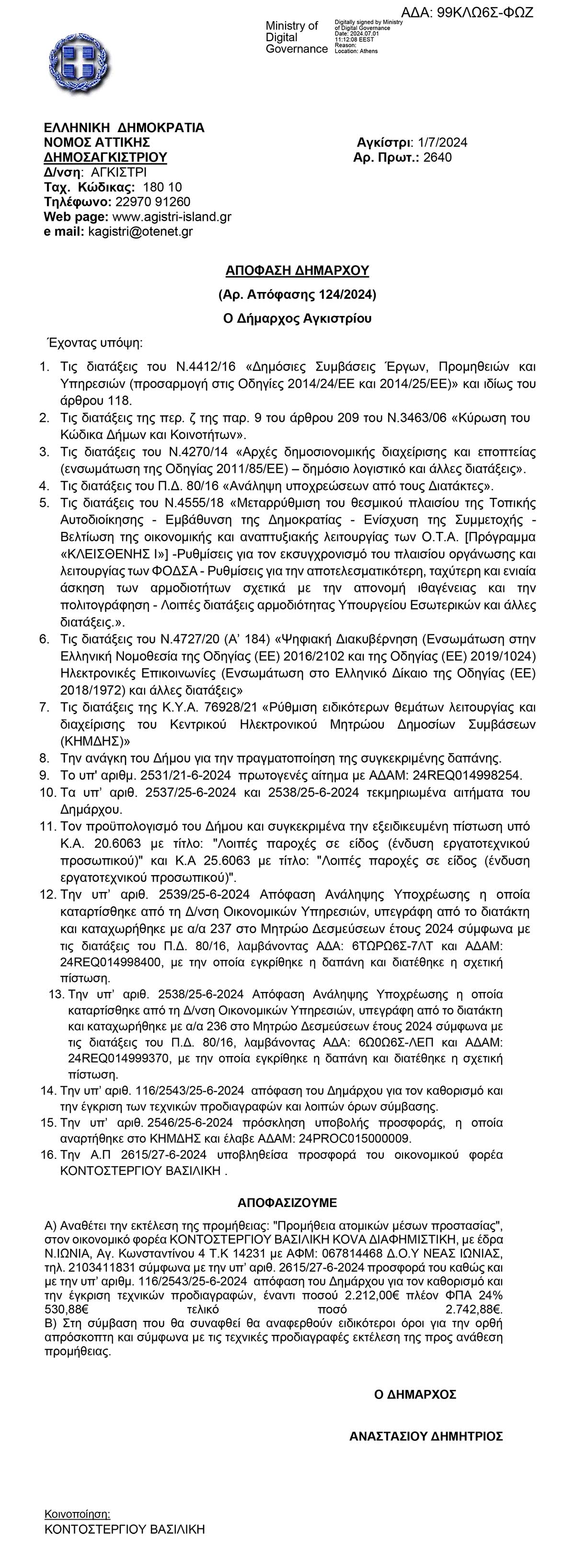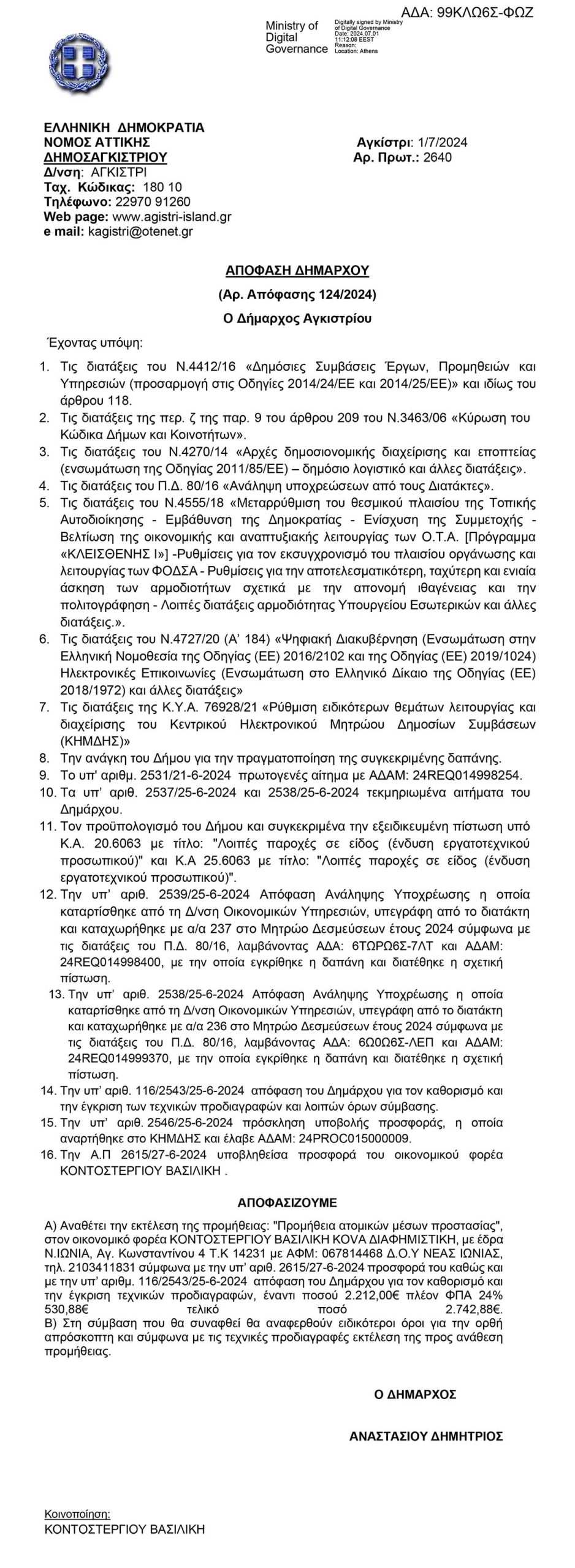 Απόφαση ανάθεσης για προμήθεια ατομικών μέσων προστασίας