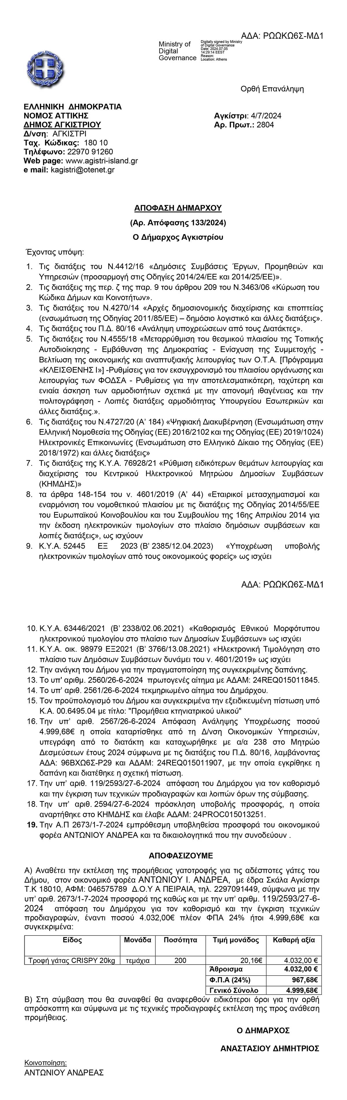 Απόφαση ανάθεσης για προμήθεια γατοτροφής