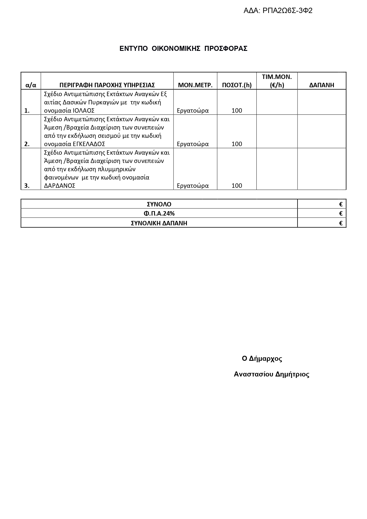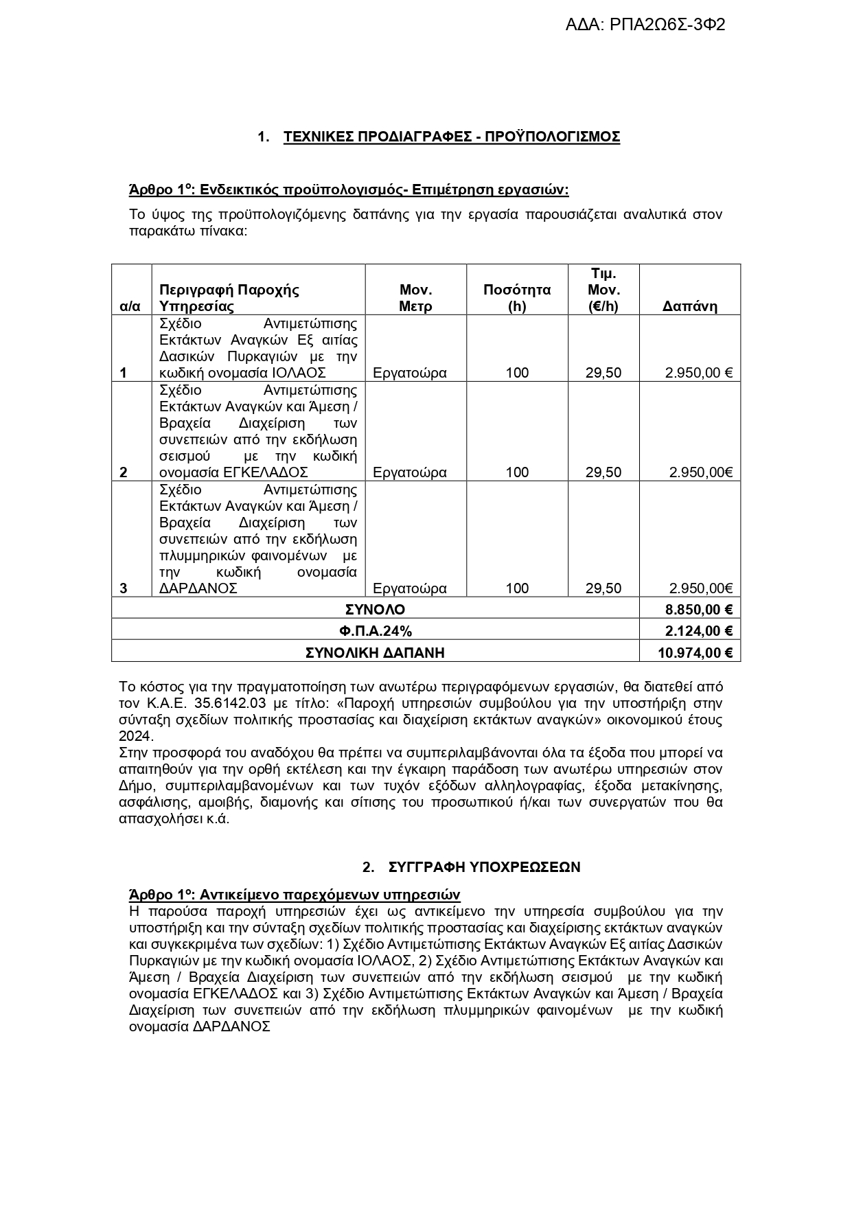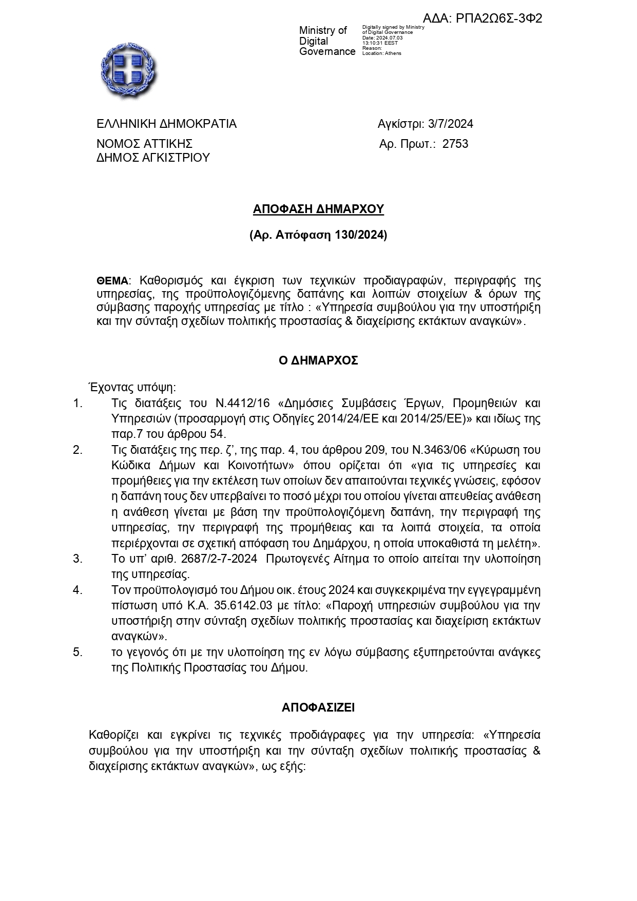 Απόφαση δημάρχου για καθορισμό και έγκριση των τεχνικών προδιαγραφών, περιγραφής της υπηρεσίας, της προϋπολογιζόμενης δαπάνης και λοιπών στοιχείων & όρων της σύμβασης παροχής υπηρεσίας με τίτλο : «Υπηρεσία συμβούλου για την υποστήριξη και την σύνταξη σχεδίων πολιτικής προστασίας & διαχείρισης εκτάκτων αναγκών»