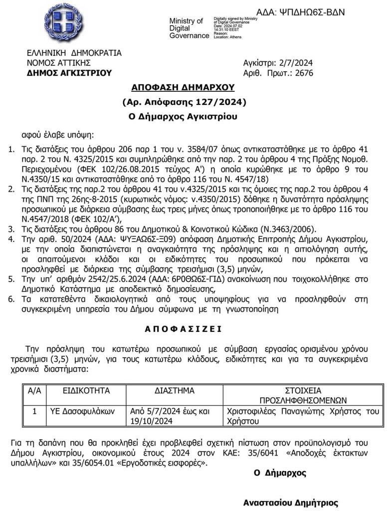 Απόφαση πρόσληψης ΥΕ Δασοφυλάκων