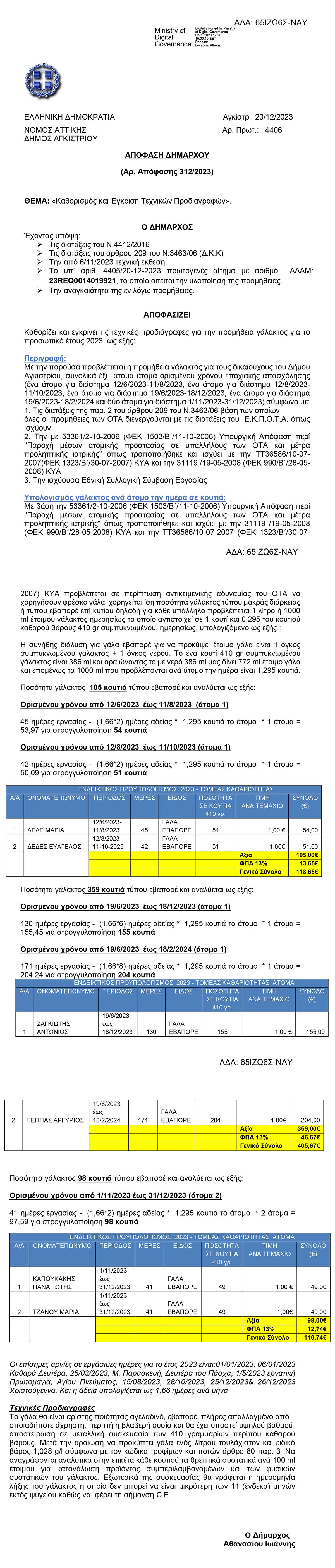 Καθορισμός και έγκριση τεχνικών προδιαγραφών για προμήθεια γάλακτος για το προσωπικό έτους 2023 20 Δεκεμβρίου 2023 ΑΠΟΦΑΣΕΙΣ ΔΗΜΑΡΧΟΥ