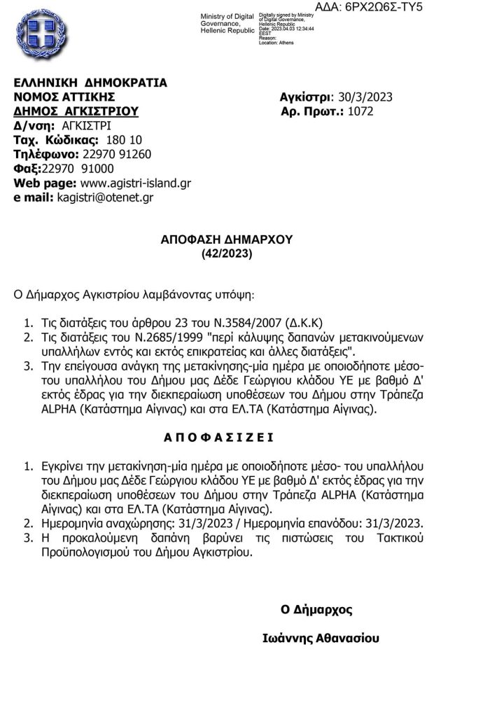 Μετακίνηση υπαλλήλου για διεκπεραίωση υποθέσεων του Δήμου