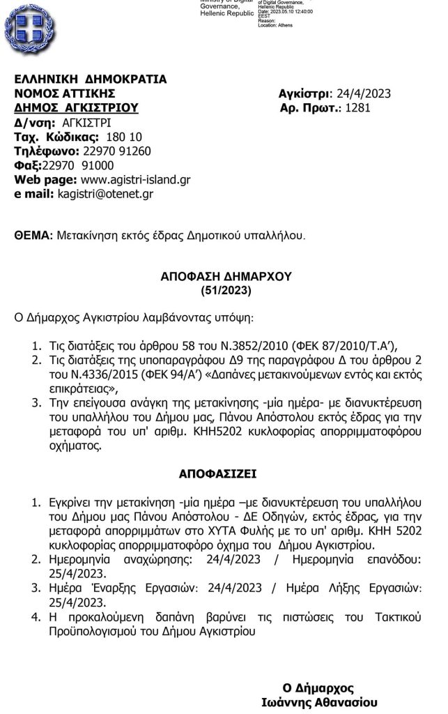 Μετακίνηση υπαλλήλου για μεταφορά απορριμματοφόρου στον ΧΥΤΑ ΦΥΛΗΣ 24 Απριλίου 2023 ΑΠΟΦΑΣΕΙΣ ΔΗΜΑΡΧΟΥ