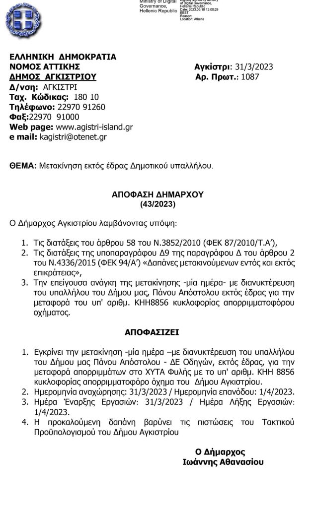 Μετακίνηση υπαλλήλου για μεταφορά απορριμματοφόρου για ΧΥΤΑ ΦΥΛΗΣ