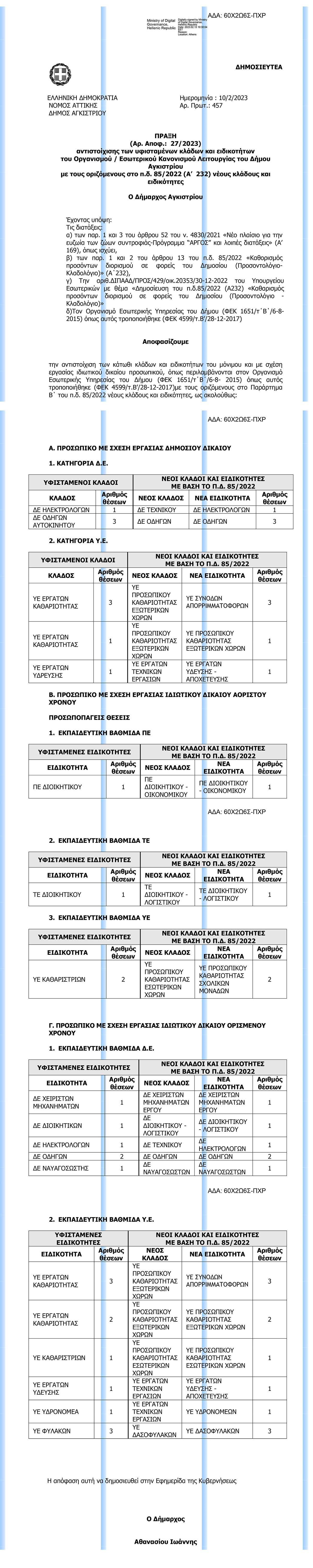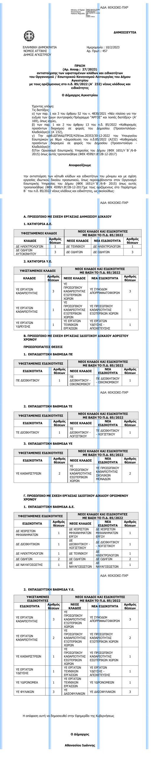 ΠΡΑΞΗ αντιστοίχισης των υφισταμένων κλάδων και ειδικοτήτων του Οργανισμού / Εσωτερικού Κανονισμού Λειτουργίας του Δήμου Αγκιστρίου με τους οριζόμενους στο π.δ. 85/2022 (Α’ 232) νέους κλάδους και ειδικότητες