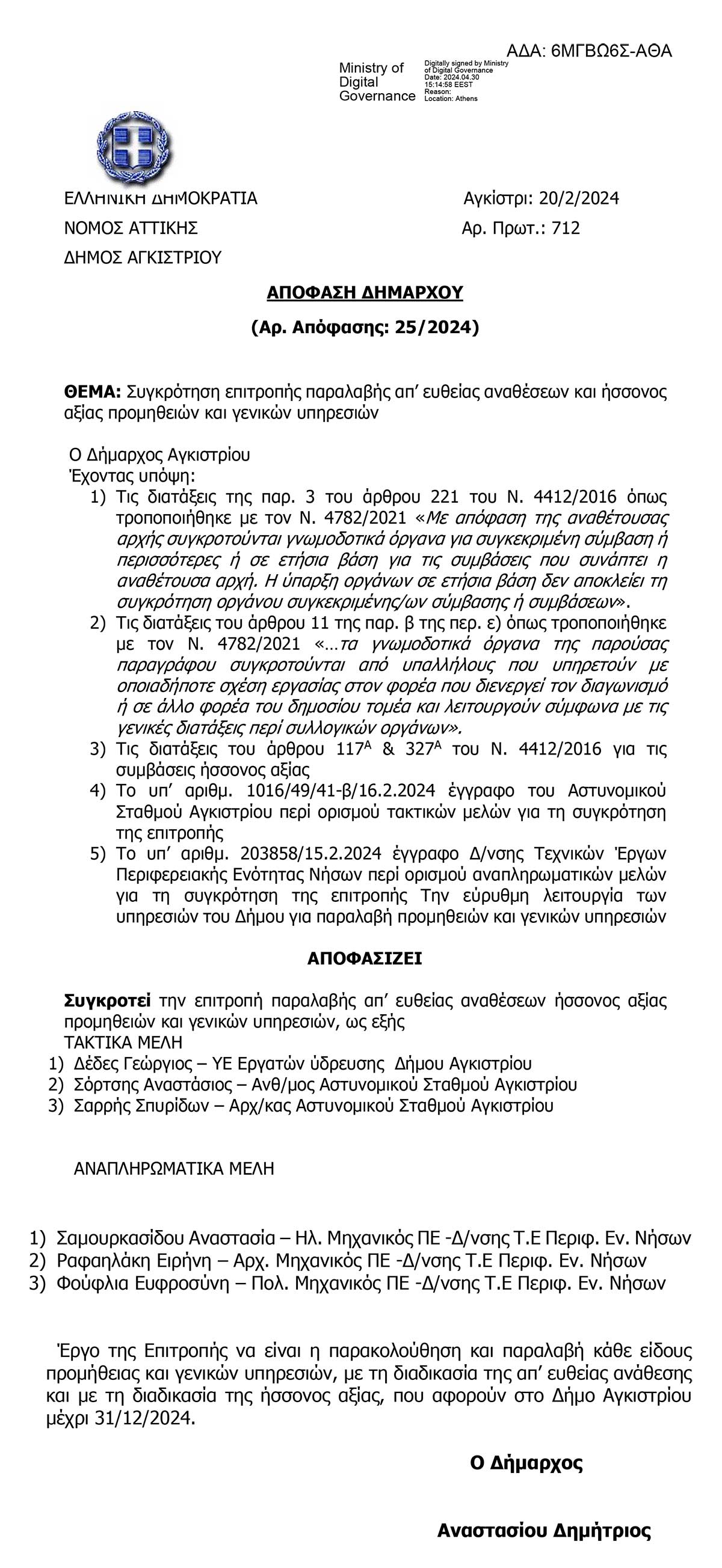 Συγκρότηση επιτροπής παραλαβής απ’ ευθείας αναθέσεων και ήσσονος αξίας προμηθειών και γενικών υπηρεσιών 20 Φεβρουαρίου 2024 ΑΠΟΦΑΣΕΙΣ ΔΗΜΑΡΧΟΥ