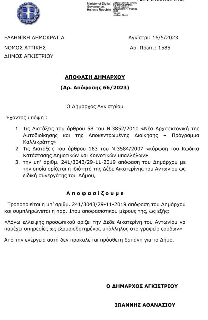 Τροποποίηση απόφασης δημάρχου για ειδικό συνεργάτη