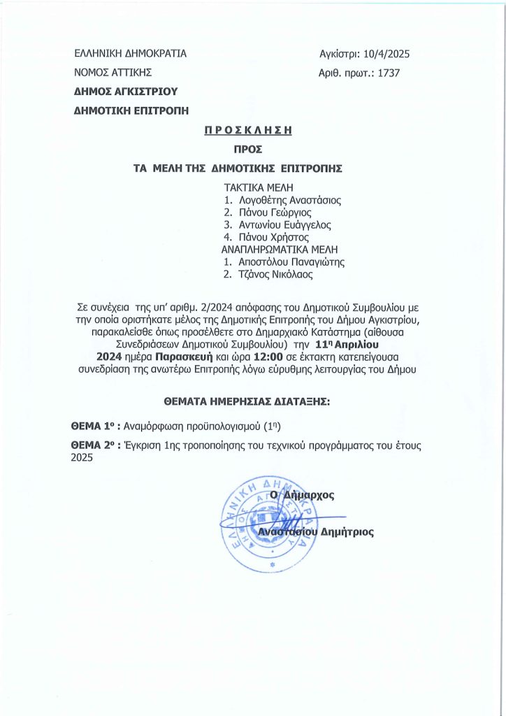 10η έκτακτη Συνεδρίαση της Δημοτικής Επιτροπής, Παρασκευή 11 Απριλίου 2025 και ώρα 12.00 10 Απριλίου 2025 ΠΡΟΣΚΛΗΣΕΙΣ ΣΥΜΒΟΥΛΙΩΝ ΔΗΜΟΤΙΚΗΣ ΕΠΙΤΡΟΠΗΣ