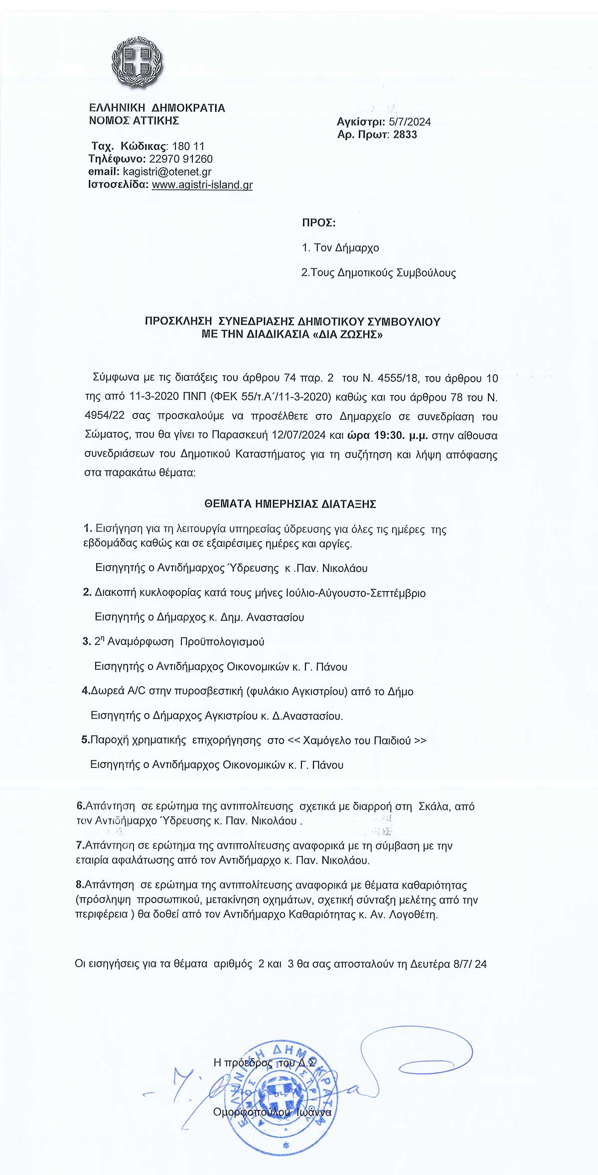 10η τακτική Συνεδρίαση του Δημοτικού Συμβουλίου, Παρασκευή 12 Ιουλίου 2024 και ώρα 19.30 11 Ιουλίου 2024 ΠΡΟΣΚΛΗΣΕΙΣ ΔΗΜΟΤΙΚΟΥ ΣΥΜΒΟΥΛΙΟΥ