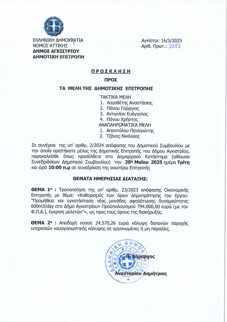 16η τακτική Συνεδρίαση της Δημοτικής Επιτροπής, Τρίτη 20 Μαΐου 2025 και ώρα 10.00