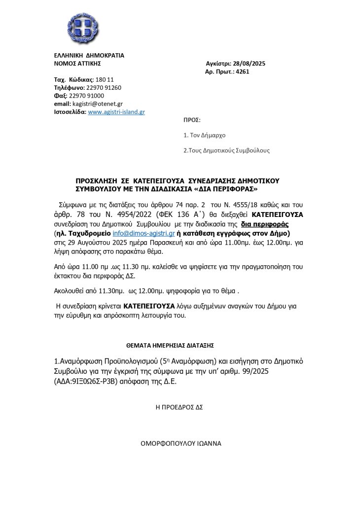 18η κατεπείγουσα Συνεδρίαση του Δημοτικού Συμβουλίου, Παρασκευή 29 Αυγούστου 2025 και ώρα 11.00 29 Αυγούστου 2025 ΠΡΟΣΚΛΗΣΕΙΣ ΔΗΜΟΤΙΚΟΥ ΣΥΜΒΟΥΛΙΟΥ