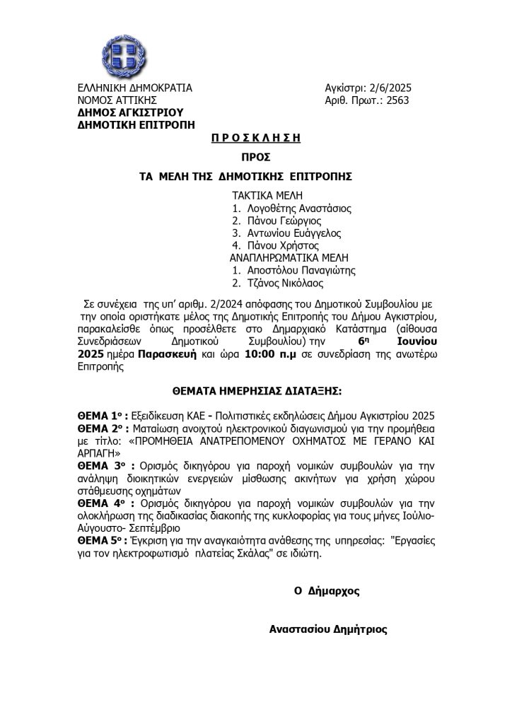 18η τακτική Συνεδρίαση της Δημοτικής Επιτροπής, Παρασκευή 6 Ιουνίου 2025 και ώρα 10.00