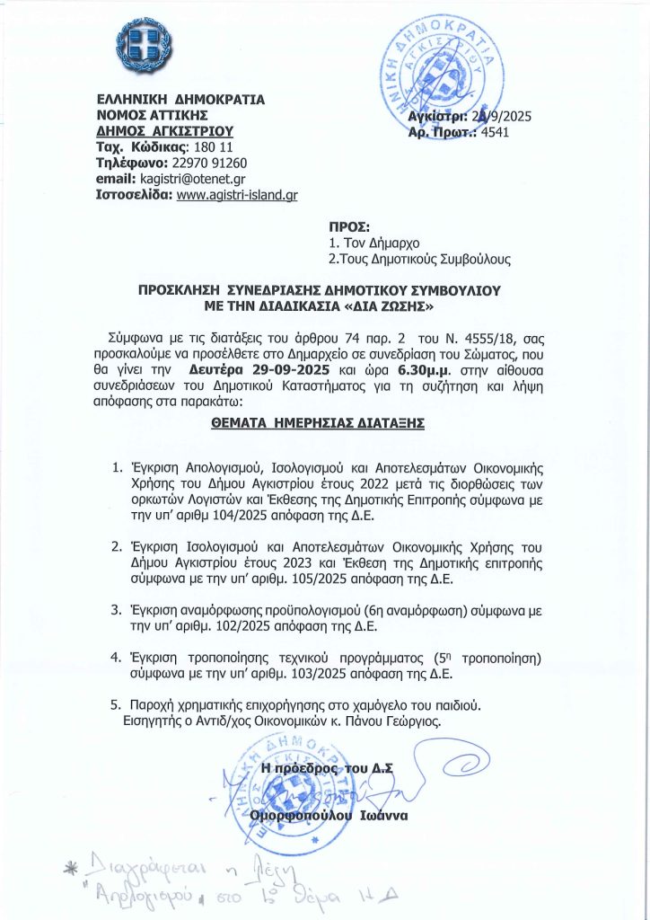19η τακτική Συνεδρίαση του Δημοτικού Συμβουλίου, Δευτέρα 29 Σεπτεμβρίου 2025 και ώρα 18.30