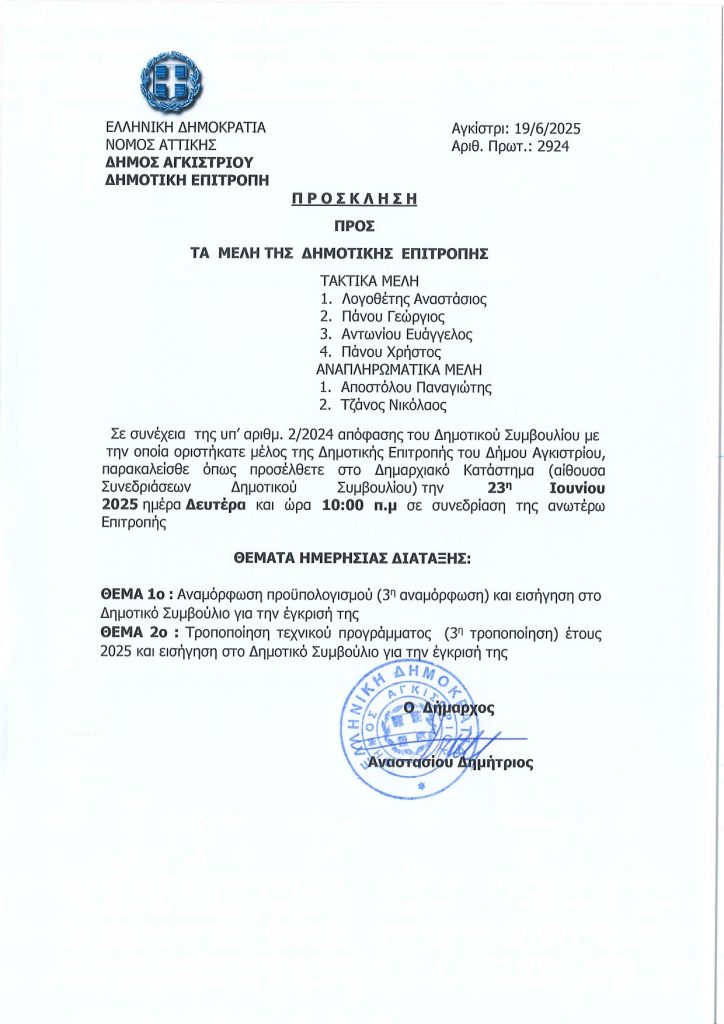 20η τακτική Συνεδρίαση της Δημοτικής Επιτροπής, Δευτέρα 23 Ιουνίου 2025 και ώρα 10.00 19 Ιουνίου 2025 ΠΡΟΣΚΛΗΣΕΙΣ ΣΥΜΒΟΥΛΙΩΝ ΔΗΜΟΤΙΚΗΣ ΕΠΙΤΡΟΠΗΣ