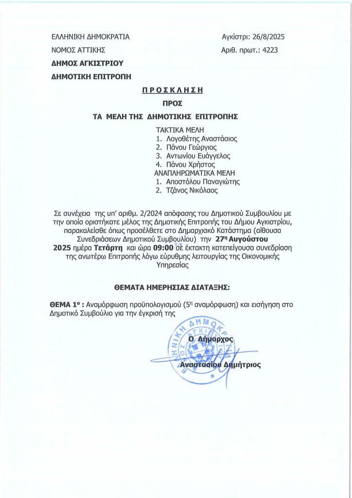 24η έκτακτη κατεπείγουσα Συνεδρίαση της Δημοτικής Επιτροπής, Τετάρτη 27 Αυγούστου 2025 και ώρα 09.00 π.μ.