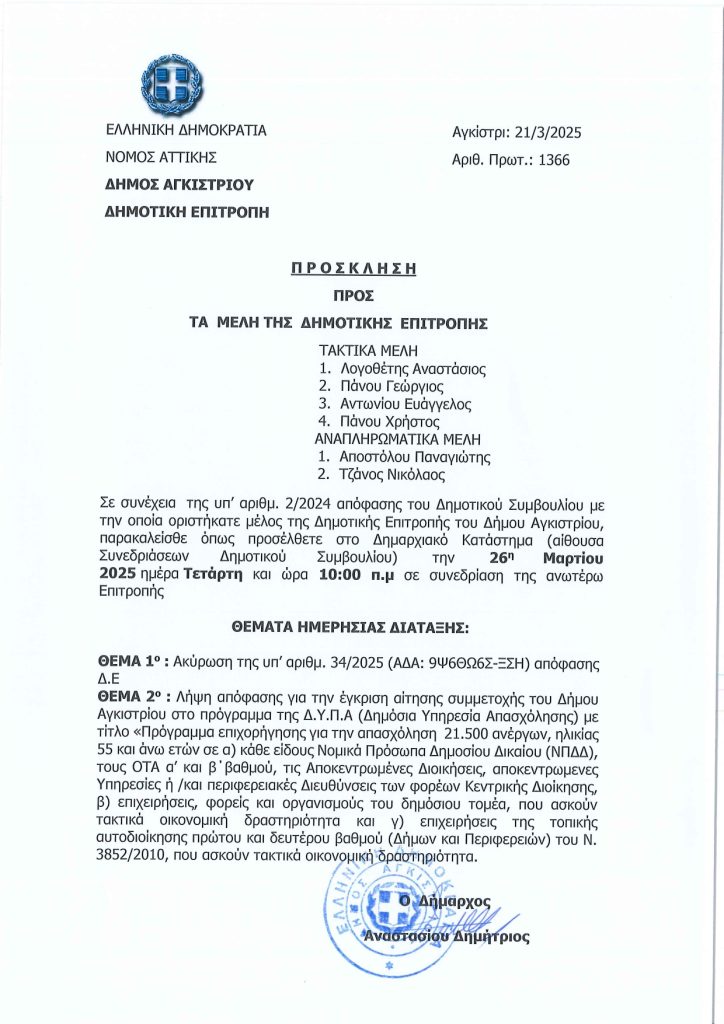 8η τακτική Συνεδρίαση της Δημοτικής Επιτροπής, Τετάρτη 26 Μαρτίου 2025 και ώρα 10.00 21 Μαρτίου 2025 ΠΡΟΣΚΛΗΣΕΙΣ ΣΥΜΒΟΥΛΙΩΝ ΔΗΜΟΤΙΚΗΣ ΕΠΙΤΡΟΠΗΣ